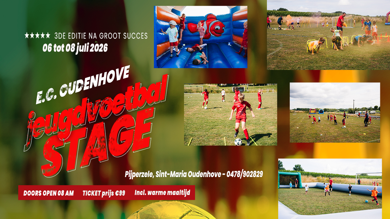 Kom deze zomer naar de E.C.O. voetbalstage (Pijperzele, Sint-Maria Oudenhove) en beleef drie dagen lang onvergetelijk voetbalplezier! Van 6 tot en met 8 juli 2026 (telkens van 8u-17u) verwelkomen we enthousiaste jonge spelers van 4 tot en met 12 jaar voor een avontuur boordevol voetbal en vriendschap. Of je nu net je eerste stappen op het veld zet of je dribbelvaardigheden wilt verbeteren, onze voetbalinitiatie en techniektrainingen zijn perfect afgestemd op elk niveau. Dit kunnen we garanderen doordat deze stage is georganiseerd door pedagogen en ervaren voetbaltrainers. Bovendien genieten de spelertjes elke dag van een warme maaltijd en vieruurtje.